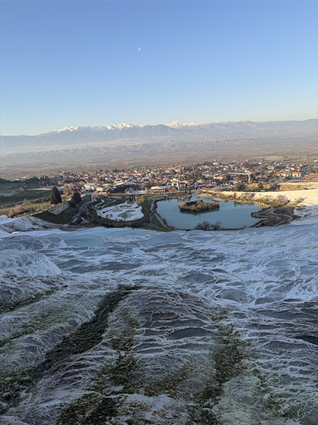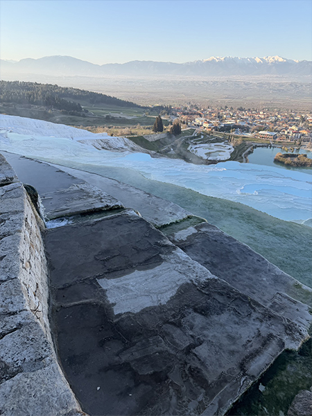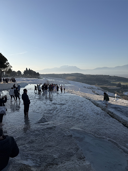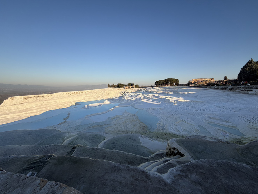 その後到着するパムッカレは、白い石灰棚が夕光のなかで異世界のように立ち上がる場である。移動の果てにこの風景へ辿り着く体験は、人工都市の幾何学と自然が作る鉱物の曲線美とを、一つの旅の流れの中で比較対照させる。つまりこの日は、人工の秩序としての都市エフェソスと、自然の秩序としてのパムッカレを連続して体感する日であった。